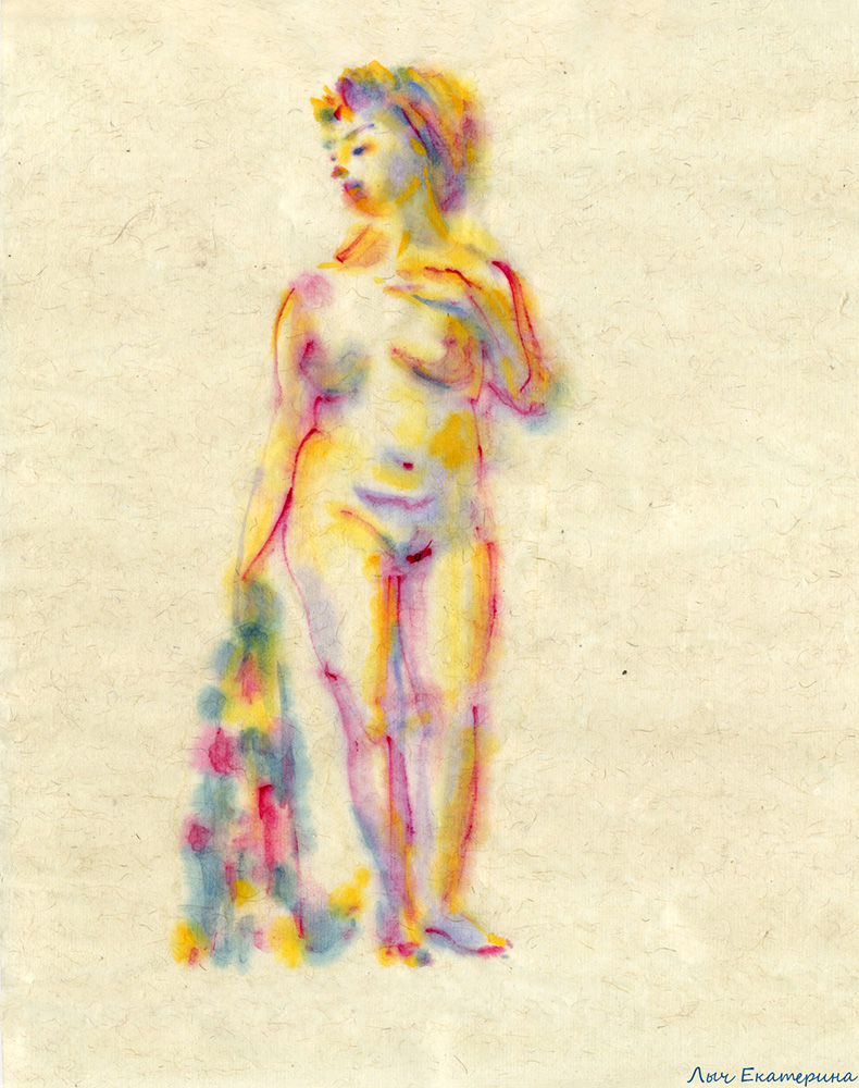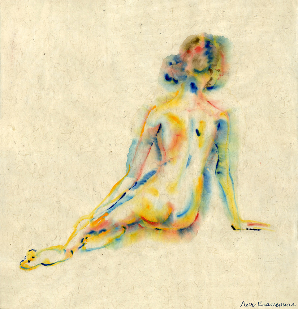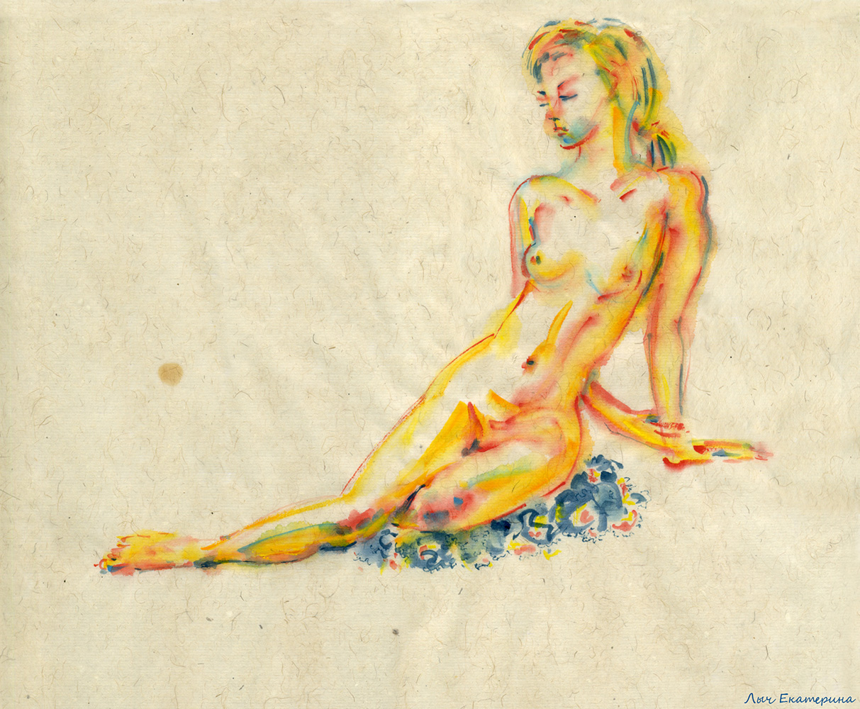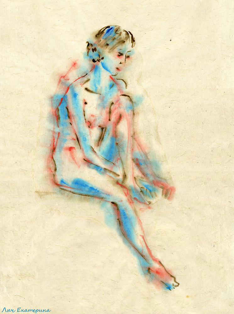 Zenski akt u studiju, deset do dvadesetpet minuta poza, slikano kineskim elemetnima( kineskim mineralnim bojama na papiru od rize).