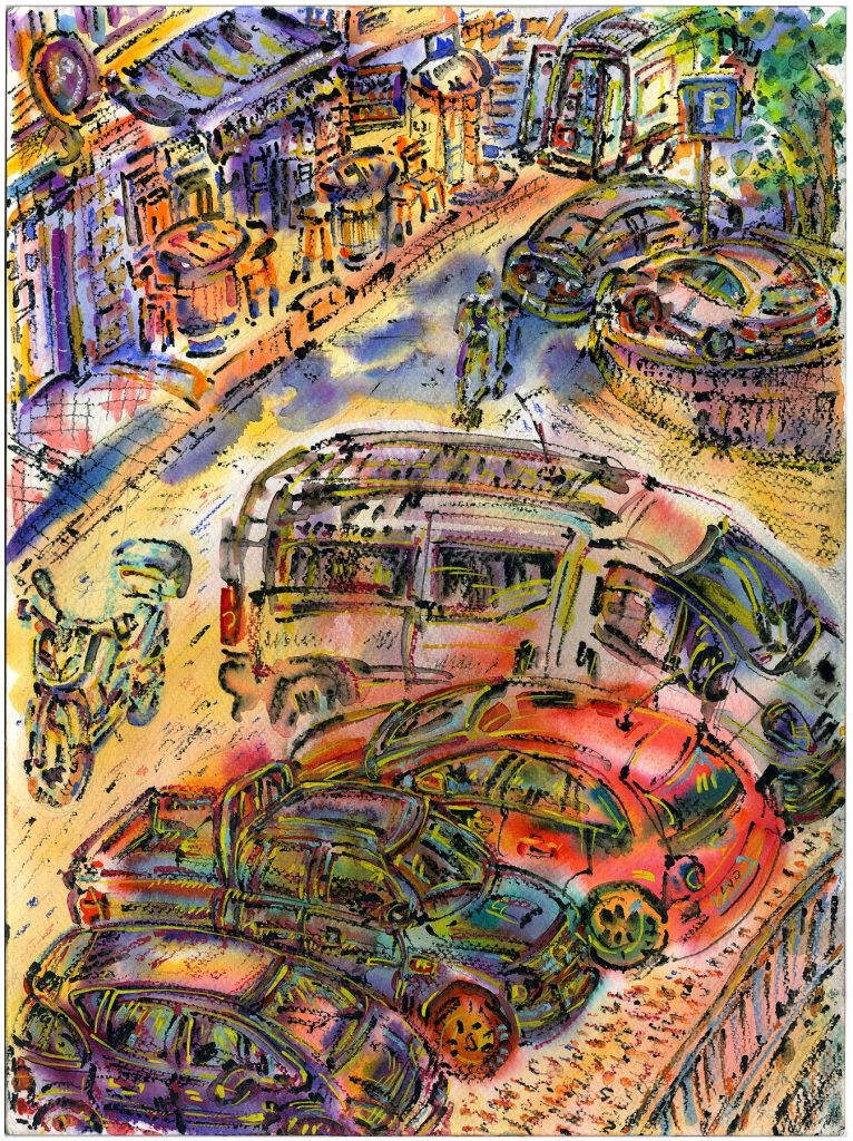 Umjetnički izražaj akvarela u ovoj seriji je osvježavajuci i spontan, koristeći mokri papir za postizanje fluidnosti i lakoće. Upotreba grafičkih elemenata olovkom dodatno naglašava dinamiku i jasnoću detalja, što omogućava posmatraču da se poveže s djelima na dubljem nivou. Ova kombinacija tehnika stvara slojevite prikaze svakodnevnih trenutaka koji često ostaju neprimećeni, ali nose bogatstvo i poeziju života.